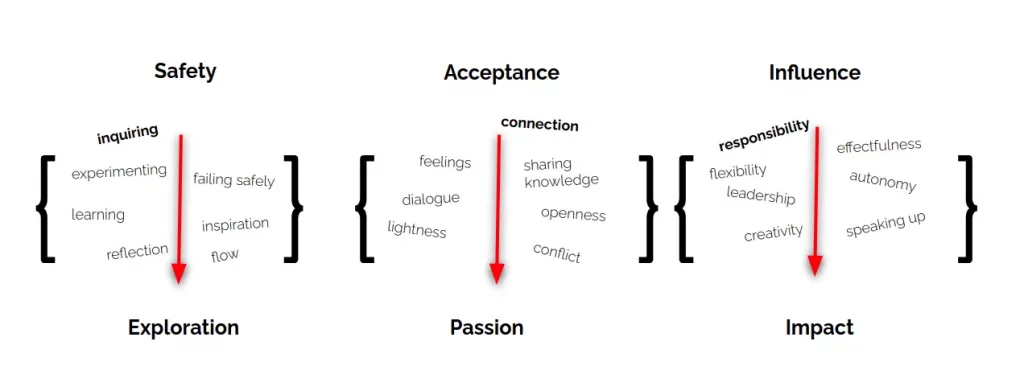 Sicherheit bedeutet nicht nur zu essen, ein Dach über dem Kopf und körperliche Unversehrtheit. In einer Organisation bedeutet es vor allem, keine Angst vor Bestrafung haben zu müssen und gleichzeitig die Möglichkeit zu haben, Grenzen zu erweitern, zu experimentieren, Dinge auszuprobieren, Fehler zu machen und gefahrlos zu scheitern.